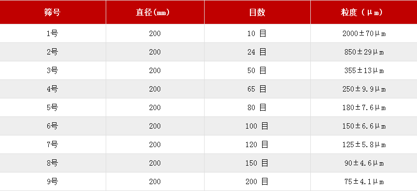 按照《中國藥典》規(guī)定,標準藥典篩網(wǎng)孔需符合GB/T6003-2012(即國際標準ISO3310),其網(wǎng)孔基本尺寸為金屬絲編織網(wǎng)試驗篩2.36mm-0.020mm,篩網(wǎng)材質(zhì)需為不易和物料發(fā)生反應的優(yōu)質(zhì)304不銹鋼構(gòu)成。國家規(guī)定的一套標準藥典篩由9個不同目數(shù)的篩格組成,依次按篩孔內(nèi)徑從大到小排成9個序號,即從1號篩開始篩孔內(nèi)徑依次減小,9號篩的篩孔內(nèi)徑最小,檢驗粒度最細。具體1~9號藥典篩目數(shù)對照表如下圖: